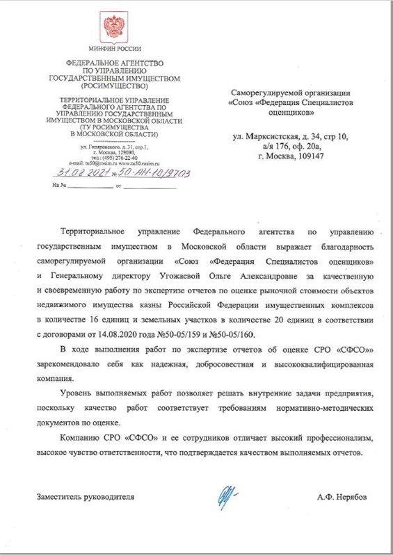 В 2021 году объявлена благодарность Заместителя руководителя Территориального управления Федерального агентства по управлению государственным имуществом в Московской области А.Ф. Нерябова за качественную и своевременную работу по экспертизе отчетов по оценке рыночной стоимости объектов недвижимого имущества казны Российской Федерации