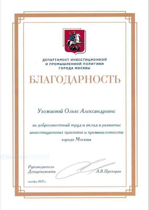 В 2021 году объявлена благодарность руководителя Департамента инвестиционной и промышленной политики города Москвы А.В. Прохорова за добросовестный труд и вклад в развитие инвестиционных проектов и промышленности города Москвы