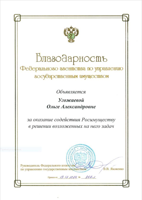 В 2024 году объявлена благодарность руководителя Федерального агентства по управлению государственным имуществом В.В. Яковенко за оказание содействия Росимуществу в решении возложенных на него задач