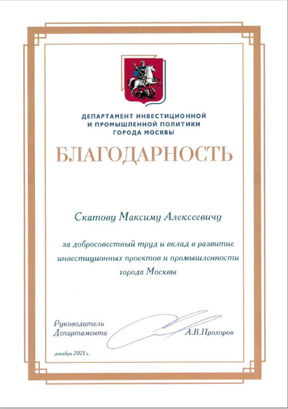 В 2021 г. объявлена благодарность Руководителя Департамента инвестиционной и промышленной политики города Москвы А.В. Прохорова за добросовестный труд и вклад в развитие инвестиционных проектов и промышленности города Москвы