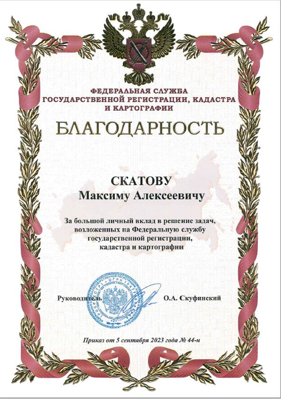 В 2023 г. объявлена благодарность Руководителя Федеральной службы государственной регистрации, кадастра и картографии О.А. Скуфинского за большой личный вклад в решение задач, возложенных на Федеральную службу государственной регистрации, кадастра и картографии