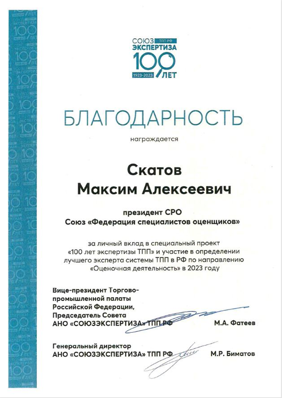 В 2023 г. объявлена благодарность Вице-президента Торгово-промышленной палаты Российской Федерации, Председателя Совета АНО «СОЮЗЭКСПЕРТИЗА» ТПП РФ М.А. Фатеева и Генерального директора АНО «СОЮЗЭКСПЕРТИЗА» ТПП РФ М.Р. Биматова за личный вклад в специальный проект «100 лет экспертизы ТПП» и участие в определении лучшего эксперта системы ТПП в РФ по направлению «Оценочная деятельность» в 2023 году