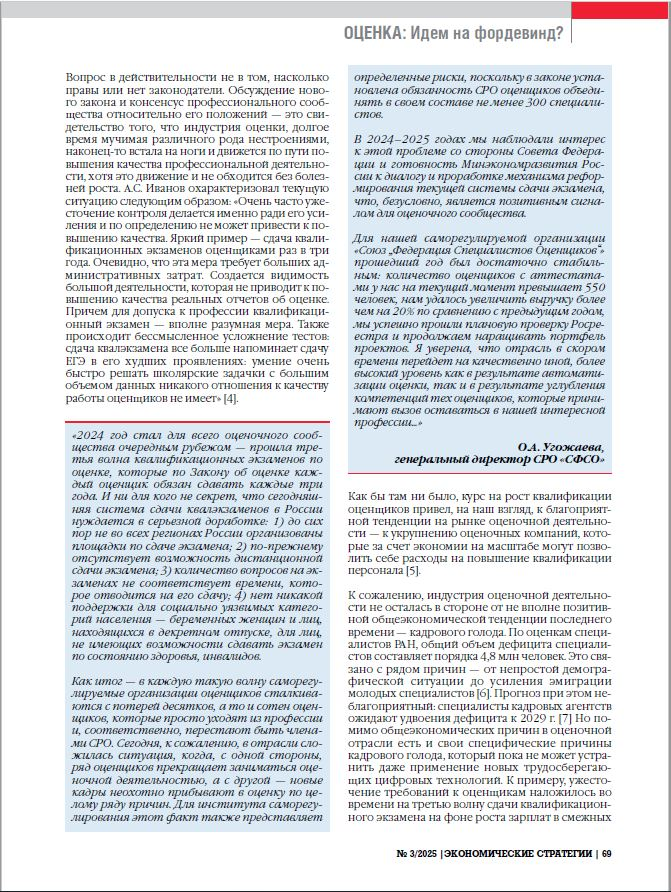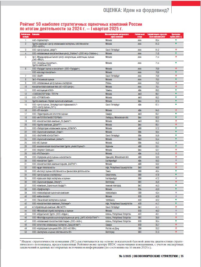 Рейтинг стратегического потенциала оценочных компаний России опубликован в журнале «Экономические стратегии» № 3 (201) / 2025 (см. Побываев С.А. Пока дует фордевинд. Индустрия оценки в 2024 году // Экономические стратегии. 2025. № 3(201). С. 66–76. DOI: https://doi.org/10.33917/es-3.201.2025.66-76).