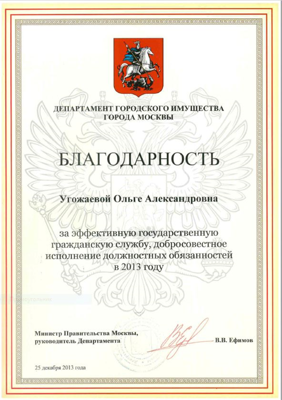 В 2013 году объявлена благодарность Министра Правительства Москвы, руководителя Департамента городского имущества города Москвы В.В. Ефимова за эффективную государственную гражданскую службу, добросовестное исполнение должностных обязанностей в 2013 году