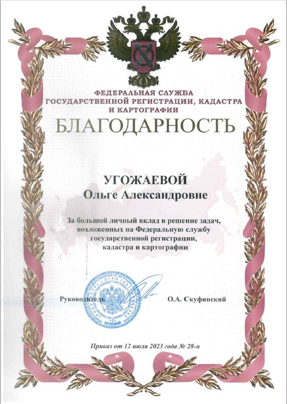 В 2023 году объявлена благодарность руководителя Федеральной службы государственной регистрации, кадастра и картографии О.А. Скуфинского за большой личный вклад в решение задач, возложенных на Федеральную службу государственной регистрации, кадастра и картографии