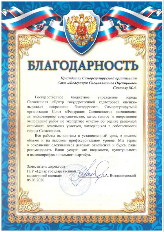В 2020 г. объявлена благодарность Заместителя директора ГБУ «Центр государственной кадастровой оценки» Д.А. Воздвиженского за плодотворное сотрудничество, качественное и оперативное выполнение работ по экспертизе отчетов об оценке рыночной стоимости земельных участков, находящихся в собственности города Севастополя