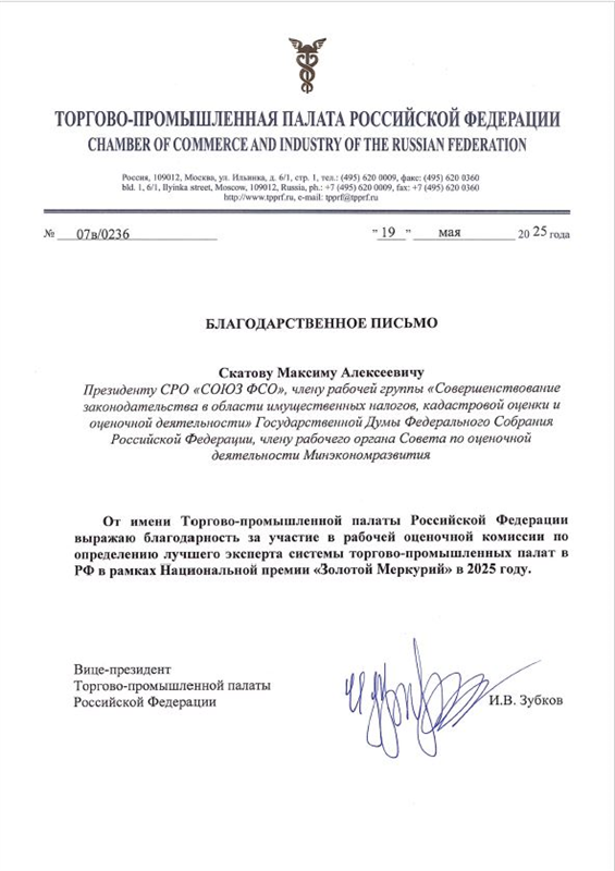 В 2025 г. объявлена благодарность Вице-президента Торгово-промышленной палаты Российской Федерации И.В. Зубкова за участие в рабочей оценочной комиссии по определению лучшего эксперта системы торгово-промышленных палат в РФ в рамках Национальной премии «Золотой Меркурий» в 2025 году